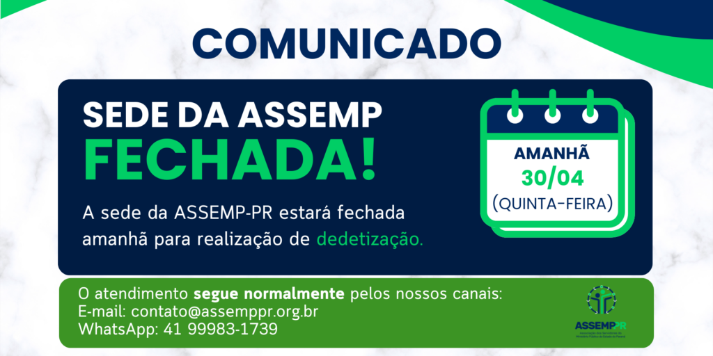 A ASSEMP-PR convida seus Associados, dependentes e respectivos convidados para o tradicional evento de comemoração ao DIA DO TRABALHADOR, no dia 1º de maio de 2026(sexta-feira), a partir das 9 horas, na CHÁCARA da Associação dos Auditores Fiscais Estaduais de Curitiba – ASAFE, em Colombo/PR – Rua Antônio Chemin, 56 – São Gabriel. Link da localização: https://g.co/kgs/P9sZ9vd