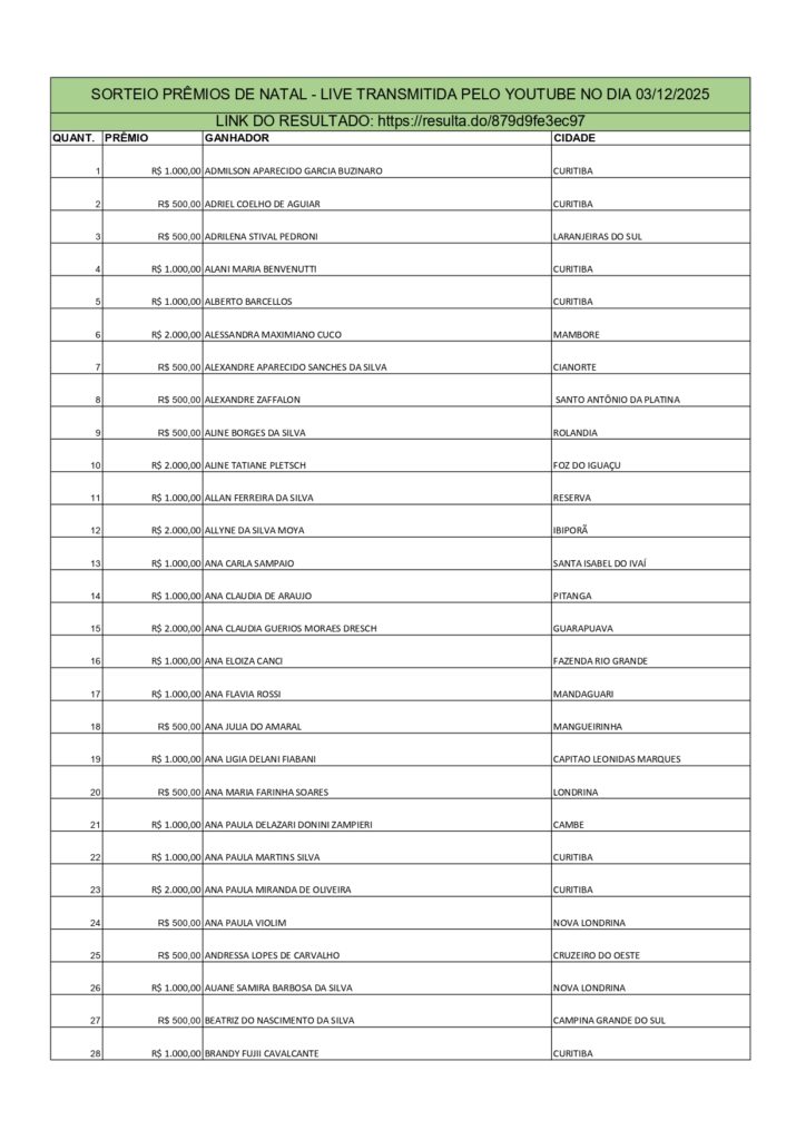 GANHADORES PRÊMIOS DE NATAL 2025 Parabéns para todos os ganhadores! Veja a Lista a Seguir: 3 dez, 2025 By Katia Francieli